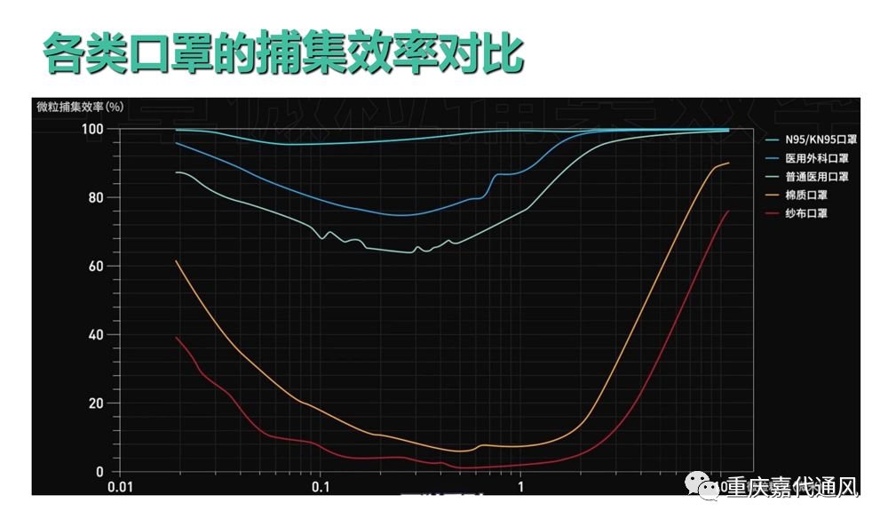 由上圖可以看出,0.3微米的顆粒是最難隔高。而大多數(shù)飛沫核尺寸在0.74~2.12微米之囘,因此戴口罩能過濾阻隔多數(shù)的病毒微粒,即使使用最差的紗布口罩也能有80%的捕集效率。而不同等級(jí)的口罩微粒捕集效率有所提高,最高可達(dá)99%。
