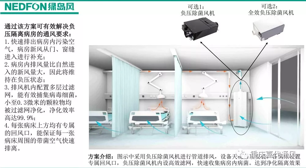 為此,綠島風(fēng)專門為醫(yī)院設(shè)計(jì)了負(fù)壓隔離病房通風(fēng)方案及優(yōu)先選擇的排風(fēng)設(shè)備。通過該方案可有效解決負(fù)壓隔離病房的通風(fēng)要求: