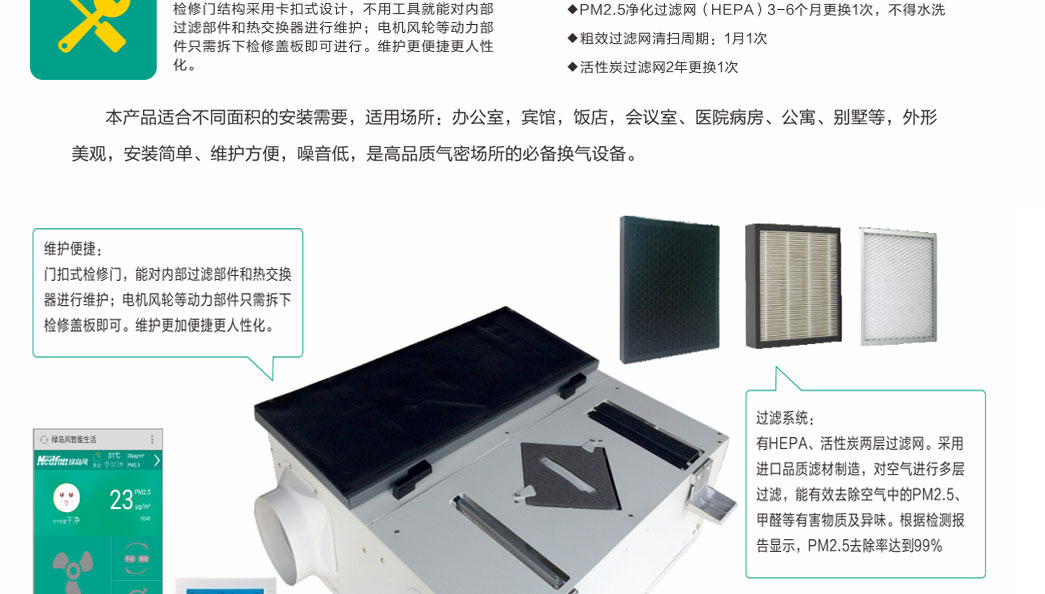 檢修門結(jié)構(gòu)采用卡扣式設(shè)計,不用工具就能對內(nèi)部過濾部件和熱交換器進(jìn)行維修;電機(jī)風(fēng)輪等動力部件只需拆下檢修蓋板即可進(jìn)行。維護(hù)更便捷更人性化?!揪S護(hù)保養(yǎng)提示:PM2.5凈化過濾網(wǎng)(HEPA)3-6個月更換一次,不得水洗。粗效過濾網(wǎng)清掃周期:1月1次?;钚蕴窟^濾網(wǎng)兩年更換一次?!?/div>
