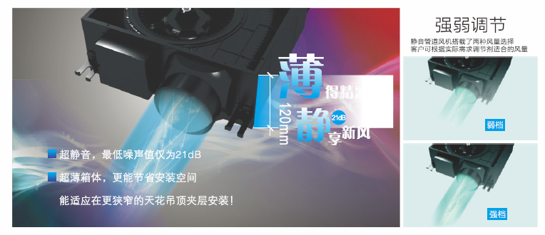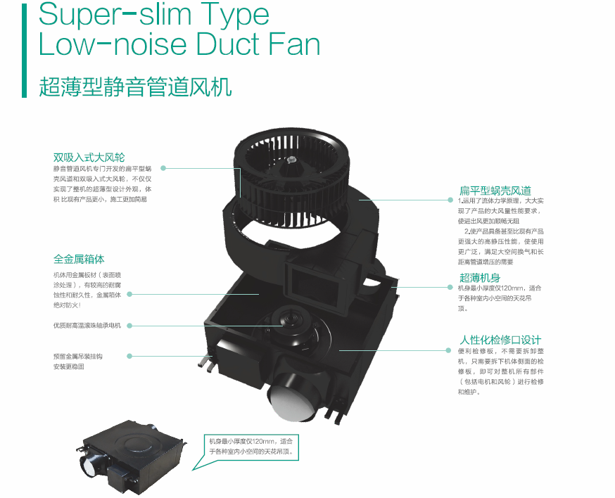 機(jī)身最小厚度僅120mm,適合于各種室內(nèi)小空間的天花吊頂。