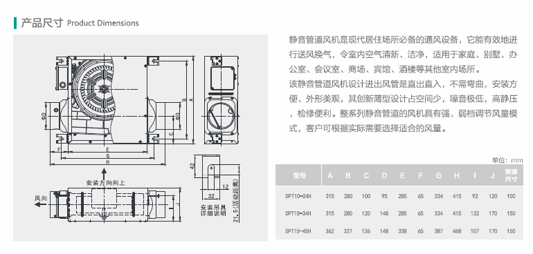 機(jī)體用金屬板材(表面噴涂處理),有較高的耐腐蝕性和耐久性,金屬箱體絕對(duì)防火!優(yōu)質(zhì)耐高溫滾珠軸承電機(jī),預(yù)留金屬吊裝掛鉤安裝更穩(wěn)固。機(jī)身最小厚度僅120mm,適合于各種室內(nèi)小空間的天花吊頂。