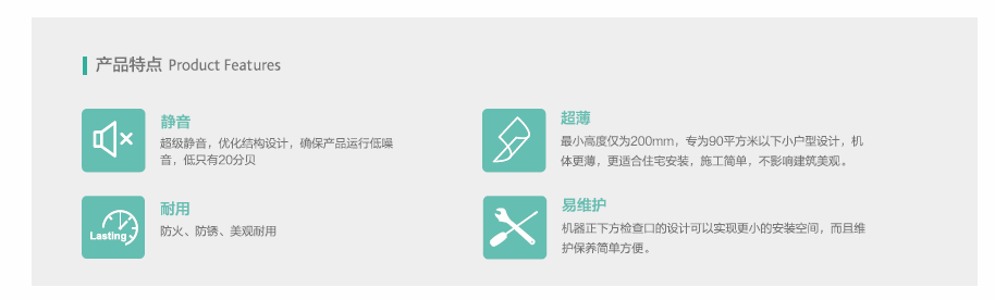 2.超薄。最小高度僅為200mm,專為90平方米以下的小戶型設(shè)計(jì),機(jī)體更薄,更適合住宅安裝,施工簡(jiǎn)單,不影響建筑美觀。